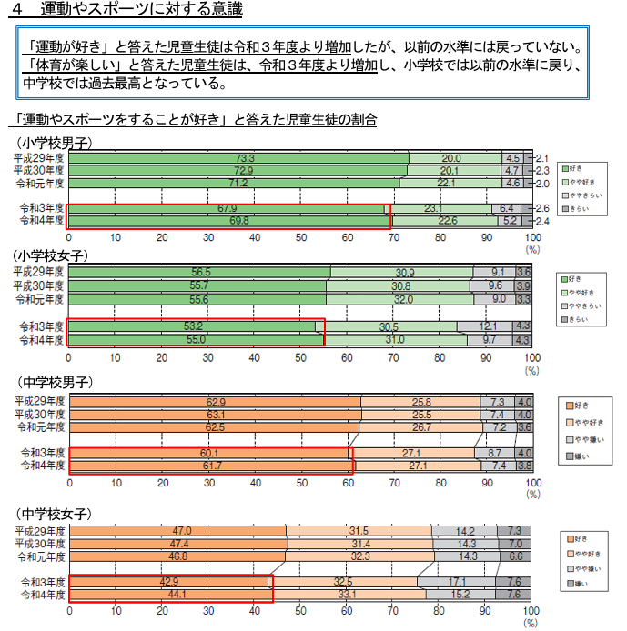 実際にスポーツ庁が行った小中学生の質問紙調査でも、約1~2割の小中学生が「運動が嫌い」という結果になっている。