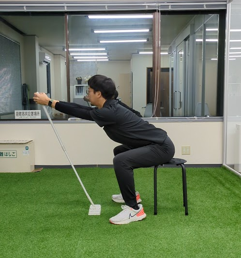 1. 椅子に浅く座り、両手を前方の背もたれや棒(モップ・ポールなど)に置く(足を肩幅より少し広めに開いておく)