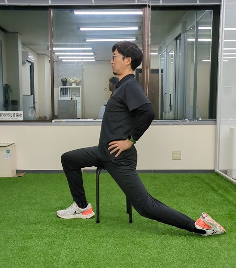 3. 背すじを伸ばし、太ももの前が伸びるところでキープ(20〜30秒)