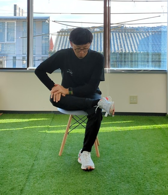 1. 椅子に座り、片足を反対の膝に乗せる