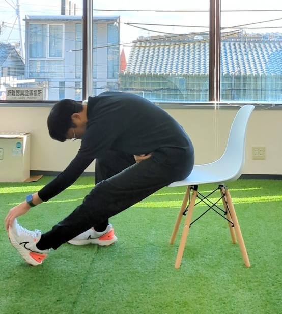 1. 椅子に浅く座り、片足を前に伸ばす