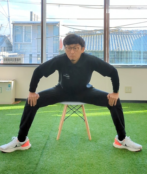 1. 椅子に浅く腰掛けて両脚を開く