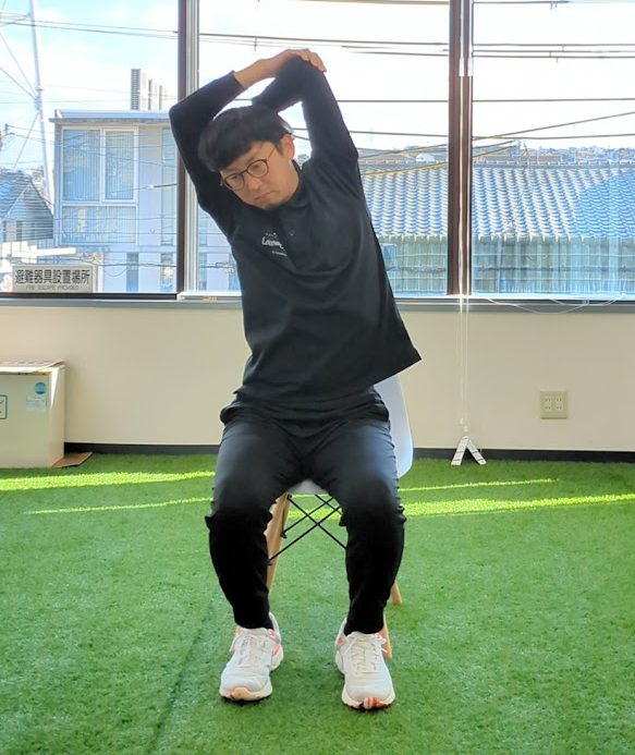1. 椅子に座り、片腕を上へ伸ばす
