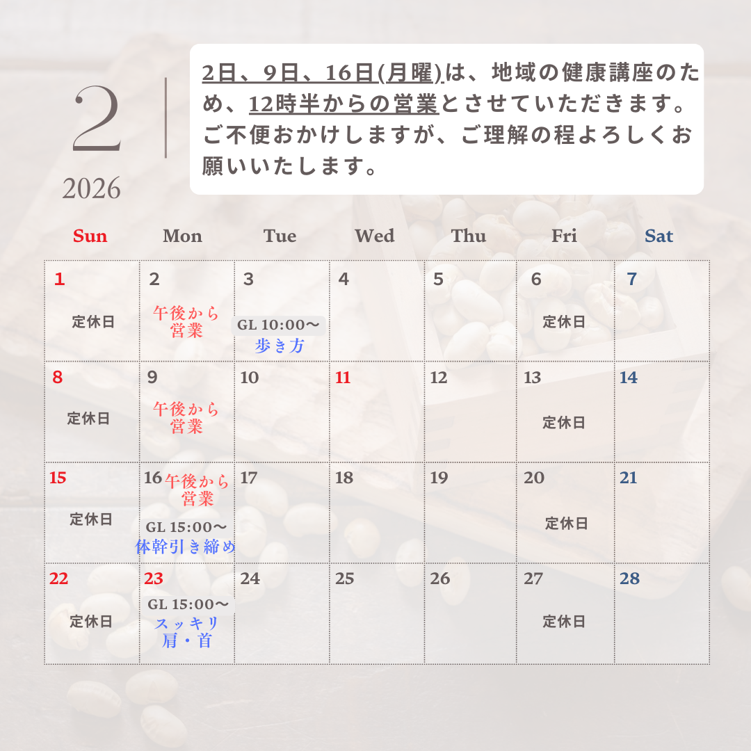 2026年2月のグループレッスンおよび営業時間についてご案内いたします。