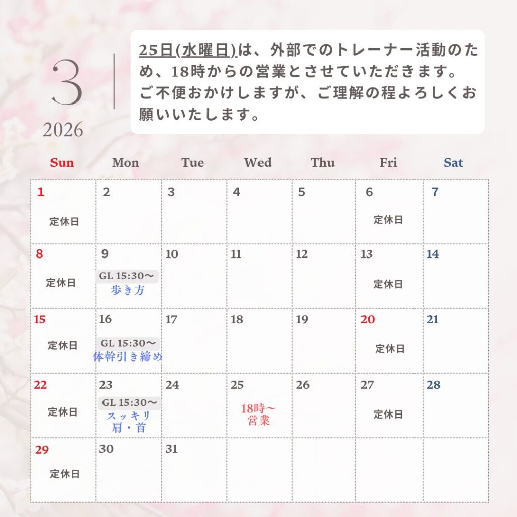 3月25日(水)は外部でのトレーナー活動のため、18時からの営業とさせていただきます。